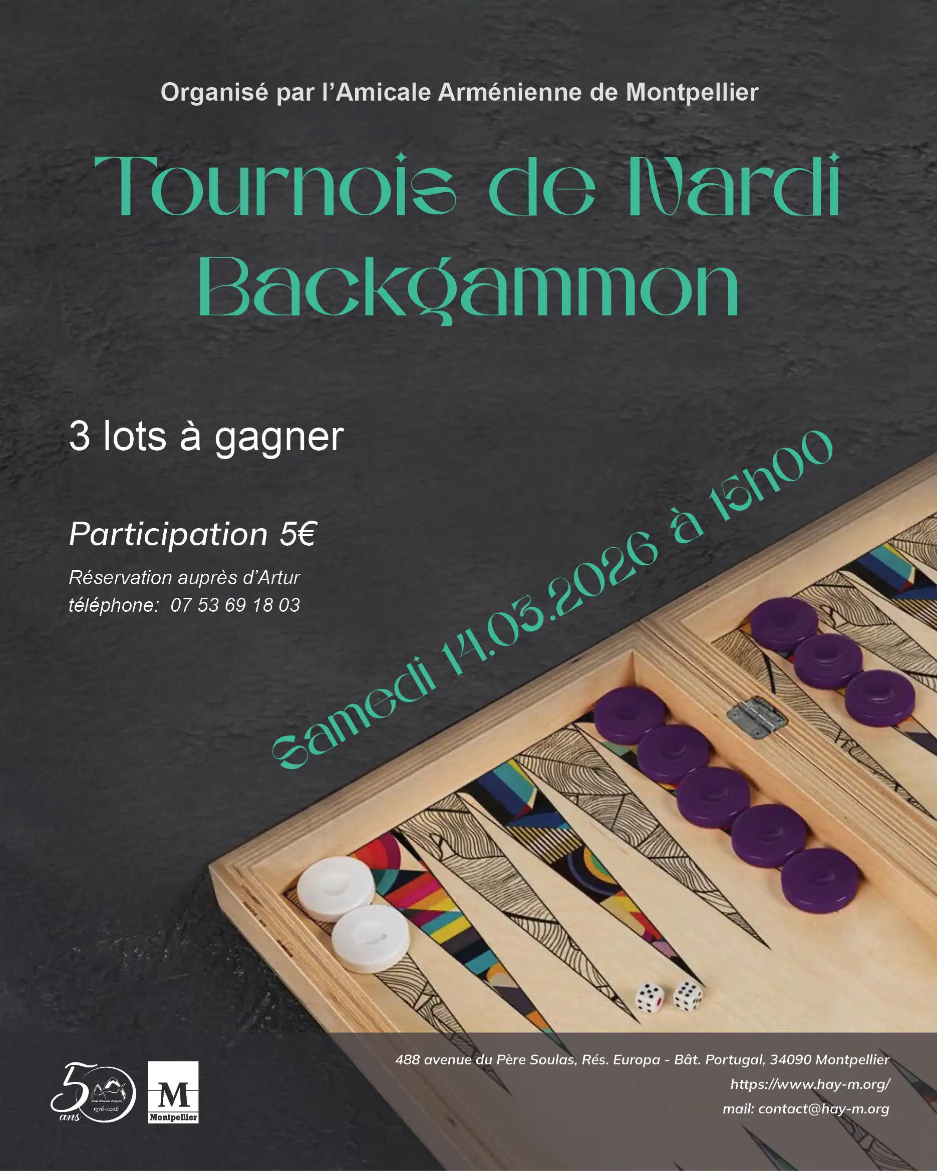 L’Amicale Arménienne de Montpellier a le plaisir d’organiser un Tournoi de Nardi (Backgammon) ouvert à tous les passionnés du jeu, débutants comme joueurs confirmés.